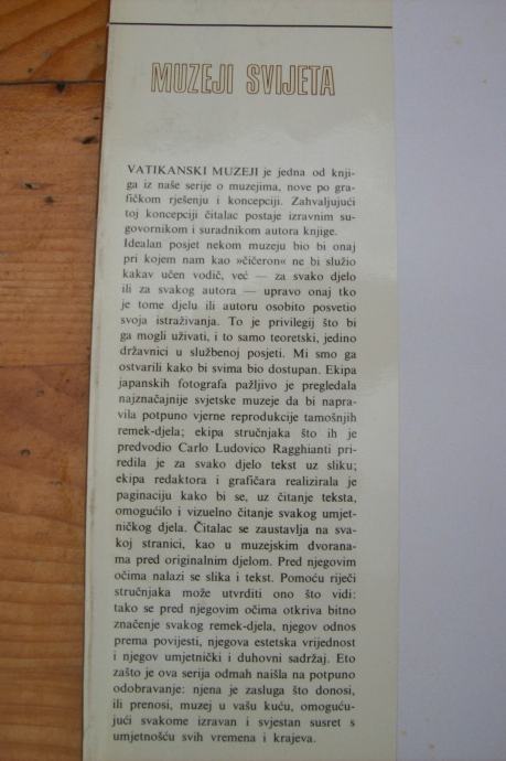 S korica: "…Čitalac se zaustavlja na svakoj stranici, kao u muzejskim dvoranama pred orginalnim djelom. Pred njegovim očima se nalazi slika i tekst. Pomoču riječi stručnjaka može utvrditi ono što vidi: tako se pred njegovim očima otkriva bitno značenje remek djela, njegov odnos prema povijesti, njegova estetska vrijednost i njegov umjetnički i duhovni sadržaj…"