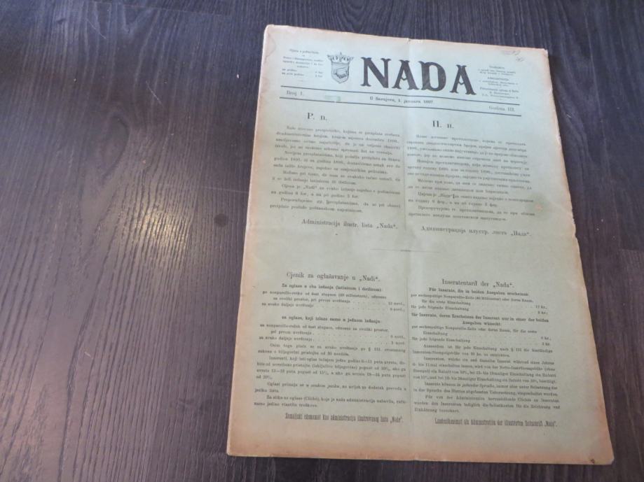Nada br.1/1897Godina III Dimenzije: 31x40Jezik: SarajevoPismo: LatinicaStanje: DobroUvez: MekiGodina: 1897