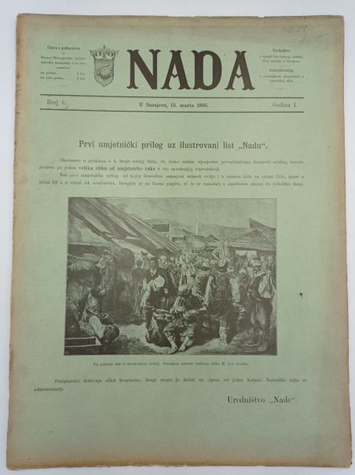 Nada br. 6/1895.Godina I. Stranica: 22Dimenzije: 30x41Jezik: SarajevoPismo: LatinicaStanje: DobroUvez: MekiGodina: 1895