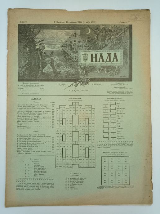 Nada br. 9/1898.Godina IV. Stranica: 22Dimenzije: 30x41Jezik: SarajevoPismo: LatinicaStanje: DobroUvez: MekiGodina: 1898