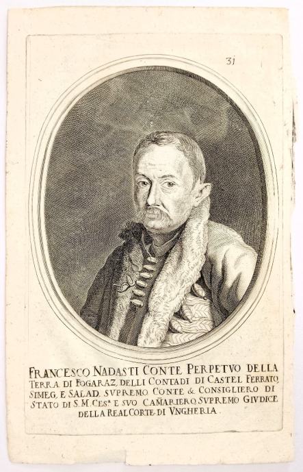 Francesco Nadasti Conte Perpetuo della Terra di Fogaraz, delli Contadi di Castel Ferrato, Simeg, e Salad, Supremo Conte & Consigliero di Stato di S. M. Cesarea e suo Camariero, Supremo Giudice della Real Corte di UngheriaPortret: Nádasdy FerencNádasdy, Ferenc III (o. 1625–71), madž. političar; sudjelovao u protuhabsburškoj uroti P. Zrinskoga, F. K. Frankapana, F. Wesselényja i E. Tattenbacha; smaknut u Bečkom Novom Mjestu 30. 4. 1671.Stranica: -Dimenzije: 18x29Jezik: /Pismo: LatinicaStanje: OdličnoUvez: MekiGodina: 1674