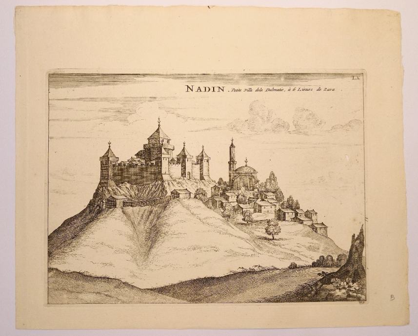 Pierre Mortier: Nadin Petite ville dela Dalmatie, 6 Lieues de Zara - Veduta NadinaBakrorezVeduta prikazuje Nadin, danas manje naselje u zaleđu Zadra, kojeg su 1538. godine zauzeli Turci i pod čijom je upravom ostao sve do 1684. godine. Veduta Nadina prikazuje nam tvrđavu koja je imala kvadratni oblik, s četvrtastim kulama na uglovima. Unutar zidina nalazio se snažan bastion s kružnim balkonom – izvidnicom za promatranje okolnog terena. Kao i većina Mortierovih veduta i ova je u potpunosti preuzeta iz Coronellijevog atlasa “Isolario dell Atlante Veneto”. Pierre Mortier: (1661-1711), nizozemski izdavač i bakrorezac koji je djelovao u Amsterdamu tijekom druge polovice 17. stoljeća i početka 18. stojeća. Izdavač Sansonovih, Jaillotovih, de Ferovih i de Witovih karata.Stranica: -Dimenzije: 33x27Jezik: AmsterdamPismo: LatinicaStanje: OdličnoGodina: 1704