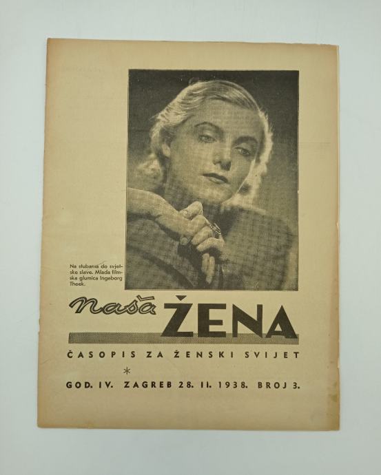 Naša žena br. 3/1938.Časopis za ženski svijetOdgovorna urednica: Ida MoklovićStranica: 16Dimenzije: 23.5x31Jezik: ZagrebPismo: LatinicaStanje: DobroUvez: MekiGodina: 1938