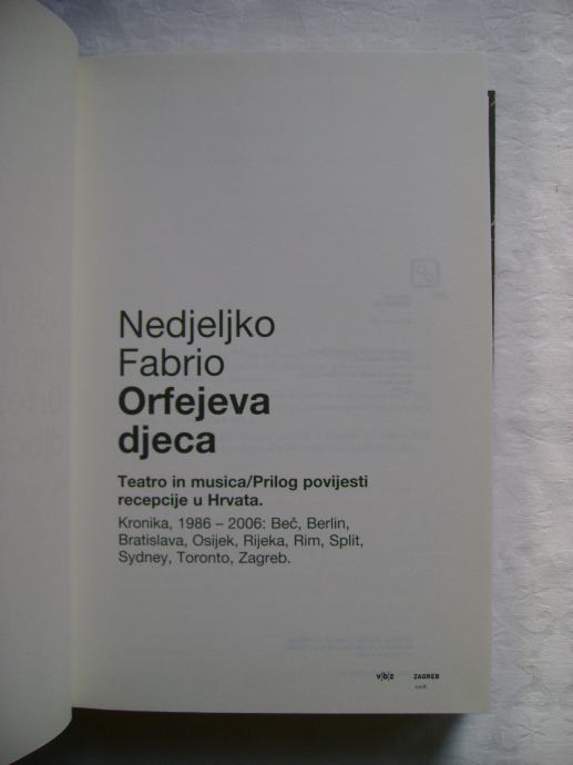 Nedjeljko Fabrio - Orfejeva djeca - Teatro in musica / Prilog povijesti recepcije u Hrvata - izdavač V.B.Z. Zagreb, 2008. godine, 16 x 24 cm, tvrdi uvez, 393 stranice.