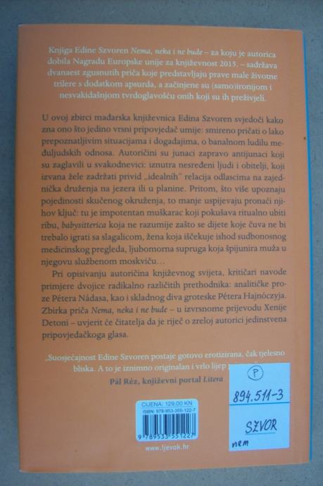 Knjiga Edine Szvoren "Nema, neka i ne bude" – za koju je autorica dobila Nagradu Europske unije za književnost 2015. – sadržava dvanaest zgusnutih priča koje predstavljaju prave male životne trilere s dodatkom apsurda, a začinjene su (samo)ironijom i nesvakidašnjom tvrdoglavošću onih koji su ih preživjeli.