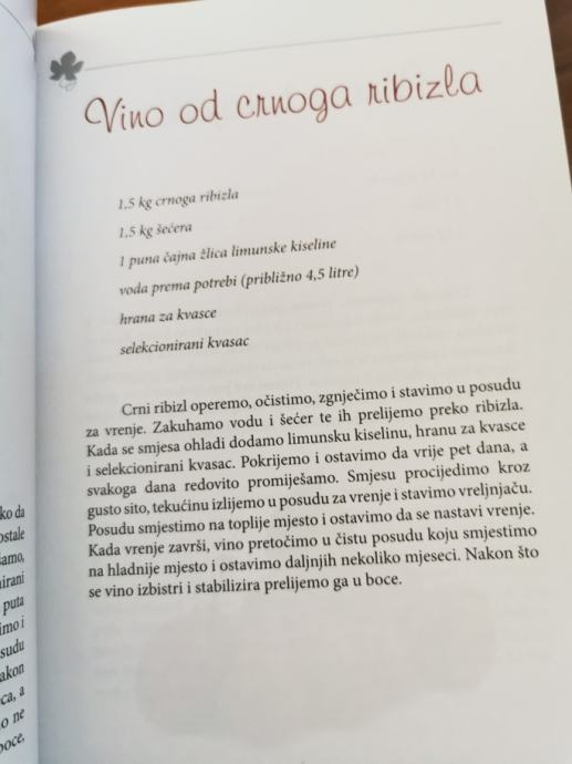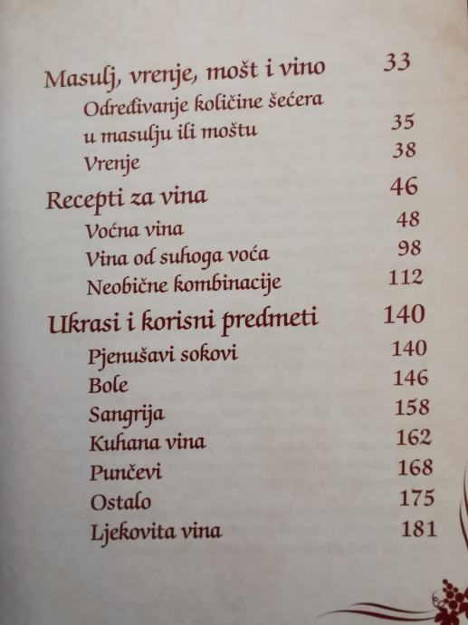 Da bismo spravljali svoja vina, ne moramo imati vinograd niti velike podrume, goleme bačve i raznu drugu opremu. Pomoću ove knjige naučit ćemo da vina možemo jednostavno pripremati kod kuće, kada god to poželimo, sa sastojcima koji su nam dostupni čitave godine. Imamo li vrt, izvrsna je to prilika da iskoristimo suvišak uroda iz voćnjaka i vrta, a vino i ukusne napitke možemo imati tijekom cijele godine. U ovom izdanju donosimo opis osnovnih postupaka te obične i neobične recepte koji će nas osvojiti svojim osvježavajućim i jedinstvenim okusima, jer se većina receptura ne koristi u komercijalnoj proizvodnji vina, pa ih ne možemo niti kupiti.
