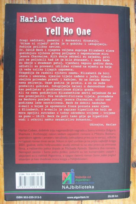 “Nikom ni riječi” je priča o gubitku i iskupljenju. Počinje prilični nevino. Dr. David Beck i njegova voljena supruga Elisabeth slave godišnjicu njihovog prvog poljupca u nepomućenom miru jezera Charmaine. Njih dvoje su odrasli zajedno, prvi put se poljubili kad im je bilo dvanaest, i sada kada su oboje u dvadesetipetoj, oženjeni nepunu godinu dana, odlučili su provesti idilični vikend na mjestu za koje ih veže toliko lijepih uspomena. Tragedija će razbiti njihovu osamu. Elisabeth će biti oteta i umorena, njeno tijelo nađeno u jarku. Njen ubojica priveden pravdi i kažnjen. No za Davida Becka nema smirenja. Osam godina će proći, a on nikada neće moći prežaliti gubitak. Iskupljenje će naći u danonoćnom radu kao pedijatar u problematičnom dijelu grada. Ali onda će se sve promijeniti na osmu godišnjicu Elisabethine smrti. Dva neidentificirana tijela pronađena su na Beckovom posjedu pored jezera Charmaine, očito već godinama leže neotkrivena. Beck će dobiti neobičan e-mail u kojem je spomenuta fraza poznata samo njemu i Elisabeth. U e-mailu je zapisan hiperlink na koji se mora spojiti sutradan u točno određeno vrijeme – vrijeme poljupca – 18.15. Beck će poći tamo gdje ga hiperlink vodi i otkriti nešto nezamislivo šokantno…. “Nikom ni riječi” uvršten je na popis najboljih knjiga 2001.