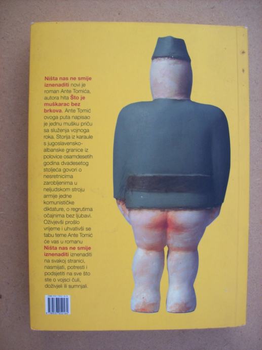 Ništa nas ne smije iznenaditi roman je Ante Tomića, autora hita Što je muškarac bez brkova. Ante Tomić ovoga puta napisao je jednu mušku priču sa služenja vojnoga roka. Storija iz karaule s jugoslavensko-albanske granice iz polovice osamdesetih godina dvadesetog stoljeća govori o nesretnicima zarobljenima u neljudskom stroju armije jedne komunističke diktature, o regrutima očajnima bez ljubavi. Oživjevši prošlo vrijeme i uhvativši se tabu teme Ante Tomić će vas u romanu Ništa nas ne smije iznenaditi iznenaditi, na svakoj stranici nasmijati, potresti i podsjetiti na sve što ste o vojsci čuli, doživjeli ili sumnjali.