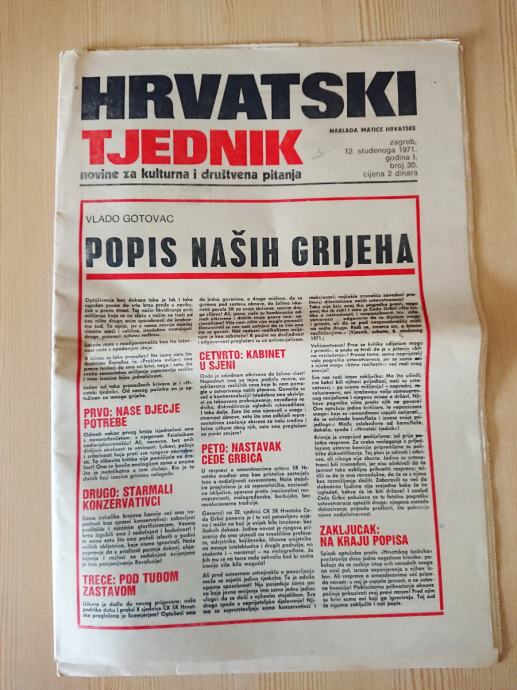 Prodajem povijesne novine Hrvatski Tjednik iz 1971.g., br.30.