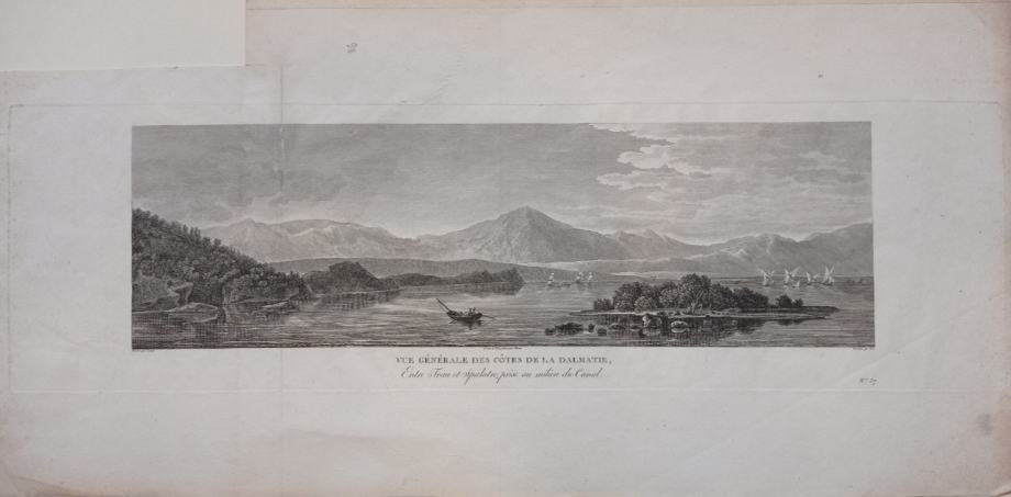 Louis-Francois Cassas i Joseph Lavallée: Obala između Trogira i Splita, gledano iz sredine morskog tjesnaca/Vue generale des cotes de la Dalmatie entre traue et Spalatro prise au milieu du canalVeduta iz monumentalnog djela „Voyage pittoresque dell'Istrie et de la Dalmatie“, Pariz, 1802.Bakrorez, šire margineDimenzije bakroreza: 50x15Ukupne dimenzije: 70x34Dimenzije: 50x15Jezik: ParizPismo: LatinicaStanje: Vrlo dobroGodina: 1802