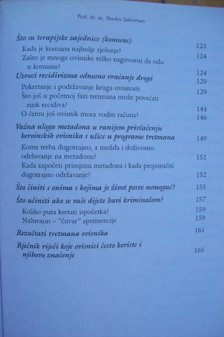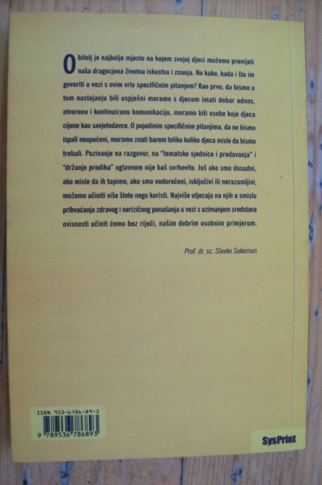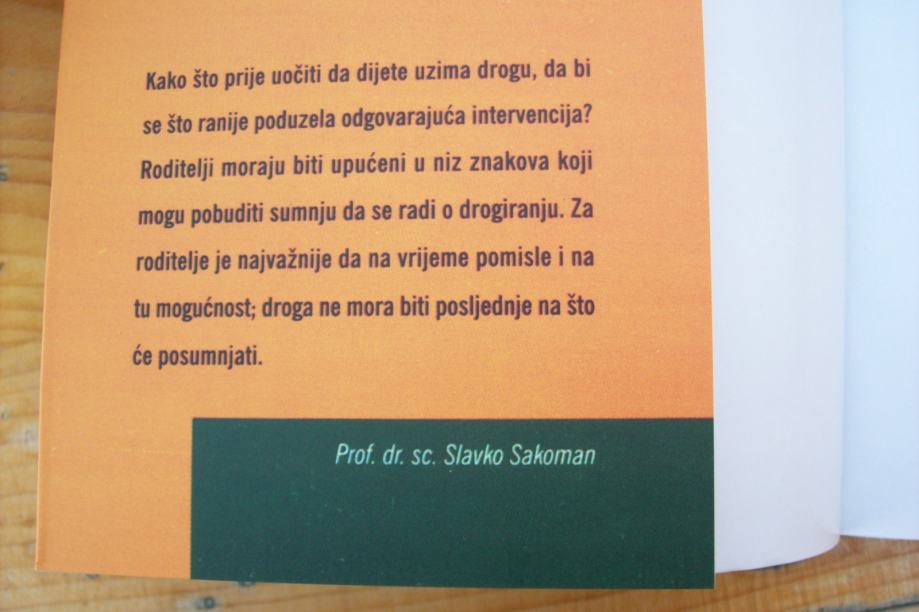 Svjestan važnosti odgoja i obitelji u sprečavanju ovisnosti o drogama, dr. Slavko Sakoman napisao je knjigu koja na pristupačan i jednostavan način roditeljima objašnjava kako trebaju reagirati ako kod svog djeteta primijete znakove drogiranja. Dr. Sakoman najprije opisuje koji su to znakovi, a zatim objašnjava kako se prema tom problemu valja postaviti te kako podržati dijete u vrijeme apstinencije i krize. Zanimljiva su i njegova stajališta o ulozi i značenju terapijskih zajednica (komuna) a tu je i rječnik najčešćih izraza koje koriste ovisnici o drogama.