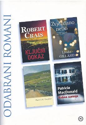 Odabrani romani: Ključni dokaz, Zvjezdano nebo, Irski seoski liječnik, Kobna sumnjaRobert Crais : Ključni dokazLinda Gillard : Zvjezdano neboPatrick Taylor : Irski seoski liječnikPatricia MacDonald : Kobna sumnjaStranica: 535Jezik: ZagrebPismo: LatinicaStanje: OdličnoUvez: TvrdiGodina: 2013