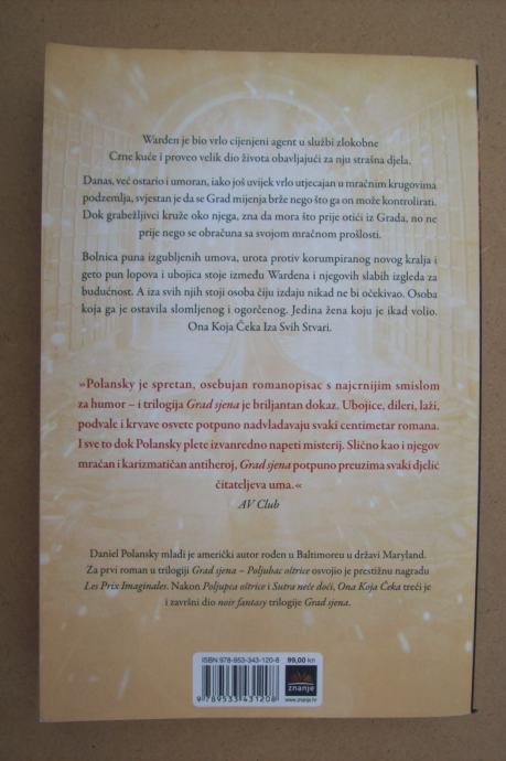 Nakon Poljupca oštrice i Sutra neće doći, Ona Koja Čeka treći je i završni dio noir fantasy trilogije Grad sjena.