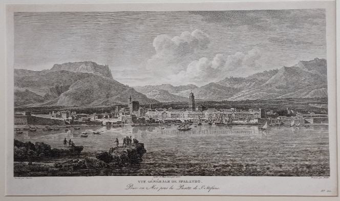 Louis-Francois Cassas i Joseph Lavallée: Opći pogled na Split, gledano s mora / Vue generale de Spalatro, Prise en Mer pres la Punta di St StefanoOpći pogled na Split, gledano s mora - Opći pogled na Split i palaču. Prema naprijed vide se zgrade raskužne bolnice, u pozadini je visoko “morlačko” gorje (les hautes montagnes des Morlaques).Veduta iz monumentalnog djela „Voyage pittoresque dell'Istrie et de la Dalmatie“, Pariz, 1802.Bakrorez, uže margineDimenzije bakroreza: 50.5x30.5Ukupne dimenzije: 52.5x31.5Dimenzije: 50.5x30.5Jezik: ParizPismo: LatinicaStanje: OdličnoGodina: 1802
