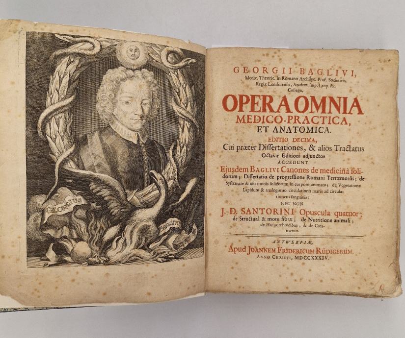 Ðuro Baglivi: Opera omnia medico-practica et anatomica Ðuro Baglivi (Dubrovnik, 1668 - Rim, 1707.), medicinski pisac i ljiječnik. Njegov je djed u Dubrovnik doselio iz Armenije, te se nazvao Armeno. Ostao je rano bez roditelja pa se o njemu brinuo stric, a nakon njegove smrti služavka Marija Dragišić, koja je Ðuru i brata dala na školovanje isusovcima, meðu kojima je bio i Ardelio della Bella. Kao daroviti đaci poslani su u Italiju i preuzeli prezime svojih odgojitelja. Ðuro je studirao medicinu u Napulju i Salernu. Veze s rodnim gradom nikada nije prekinuo. Bavi se lječništvom i radio razne pokuse na životinjama s lijekovima i biljkama. Proučavao je anatomiju, posebice istražujući mišiće i moždanu ovojnicu. Postao je liječnik pape Inocencija XII., a zatim i profesor medicine na rimskom sveučilištu La Sapienza. U Rimu je 1696. izdao svoje najbolje djelo De praxi medica, te nakon toga postao članom brojnih europskih akademija. Nakon objavljivanja druge znamenite knjige De fibra motrice et morbosa, 1700. izlaze mu od 1702. sabrana djela u 20 izdanja na latinskom, i brojni prijevodi na europskim jezicima. Zalagao se za funkcionalnu upotrebu lijekova, predvidio mogućnost kemoterapije. Bio je jedan od najvećih autoriteta medicinske znanosti. Zanimao se i za numizmatiku, pisao o mineralogiji i meteorologiji. Njegova djela ukrašena su anatomskim crtežima u bakropisu. Stranica: 434Dimenzije: 18.5x24.5Jezik: AntwerpenPismo: LatinicaStanje: Vrlo dobroUvez: MekiGodina: 1734