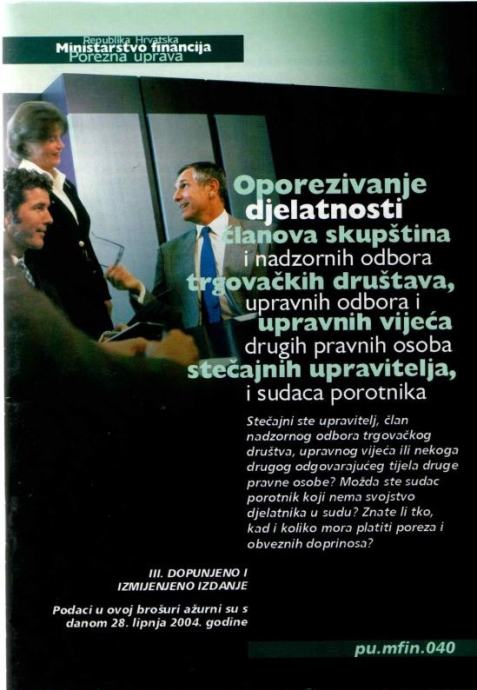 Oporezivanje djelatnosti članova skupština i nadzornih odbora trgovačkih društava, upravnih odbora i upravnih vijeća drugih pravnih osoba stečajnih upravitelja, i sudaca porotnikaStranica: 20Jezik: zagrebPismo: LatinicaStanje: OdličnoUvez: MekiGodina: 2004