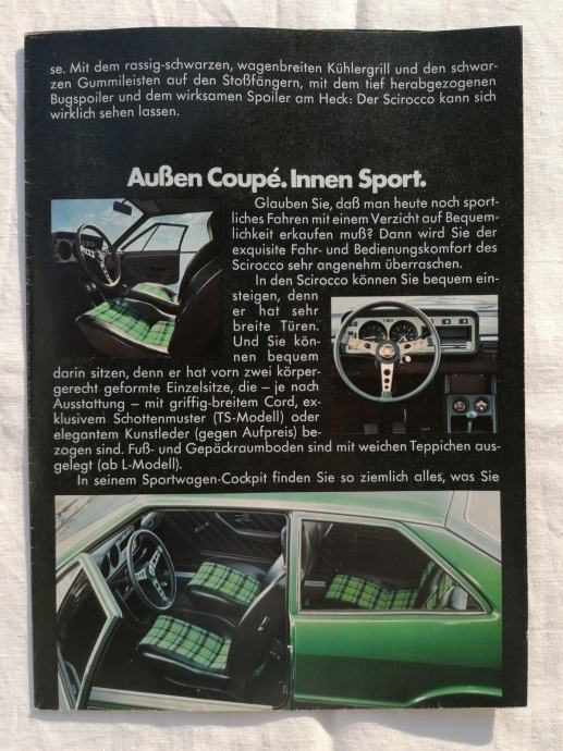 Prospekt se rasklapa i sastoji od 8 stranica bogatih slikama, opremom i tehničkim podacima, na njemačkom jeziku, plus veliki poster VW SCIROCCO sa stražnje strane, dimenzija: širina 77 cm x visina 53,5 cm.