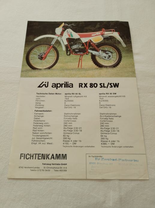 Originalni prospekt APRILIA na kojemu su prikazani modeli RX 80 SL / SW, RX 125, RX 250, MX 125 Gross, MX 250 Gross, sa tehničkim podacima, odlično očuvan, prodajem.