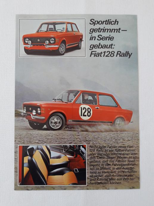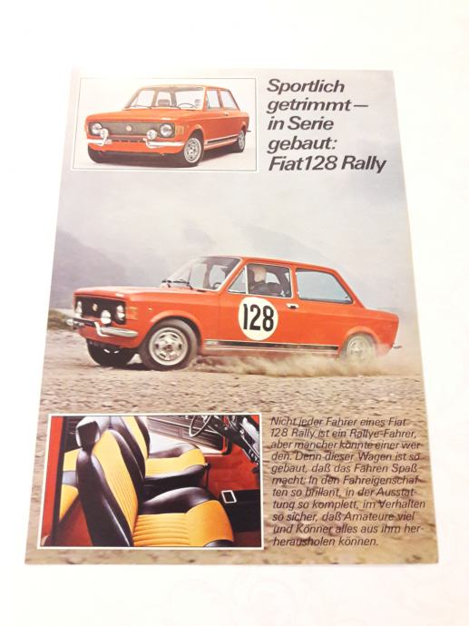 Originalni prospekt FIAT 128 RALLY iz ca. 1972. godine, bogat slikama i opisom na njemačkom jeziku, sastoji se od dvije stranice.