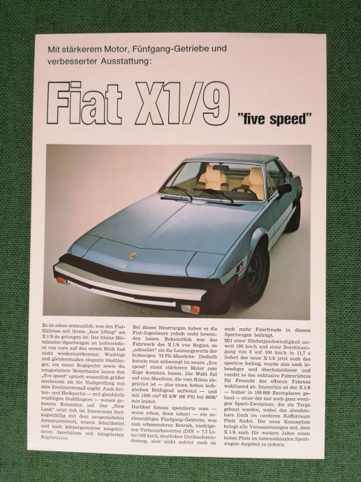 Originalni prospekt FIAT X 1/9 iz 12. mj 1978. godine, prodajem.