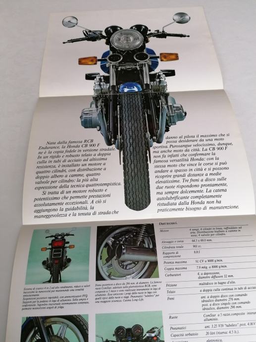 Originalni prospekt HONDA CB 900 F Bol d or iz 1980-ih godina, odlično očuvan, na šest stranica, na kvalitetnom lakiranom papiru, na talijanskom jeziku, bogat slikama, tekstualnim opisom i tehničkim podacima, vrlo rijedak prospekt.