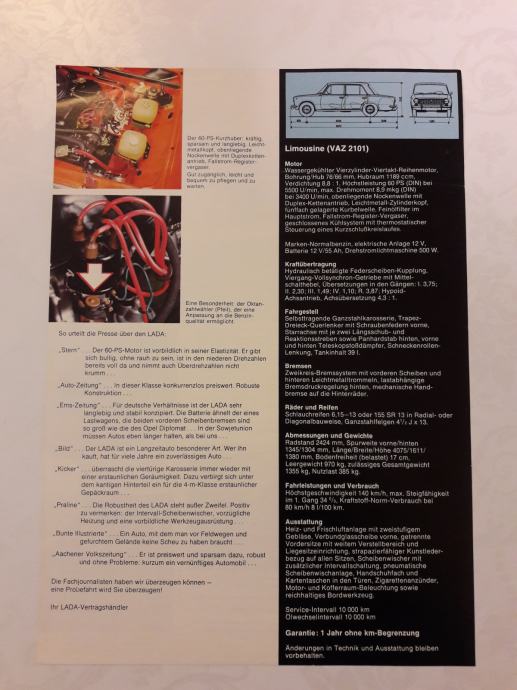 Originalni prospekt automobila Lada 1200, VAZ 2101, iz 1970-ih godina, na njemačkom jeziku, prodajem.