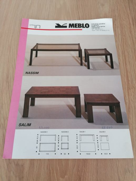 ORIGINALNI PROSPEKT namještaja MEBLO - STOLIĆI Nova gorica iz 1983. god., sa prikazanim svim modelima stolića za dnevnu sobu, koje je MEBLO proizvodio tih godina, odlično očuvan, sa svim dimenzijama svih elemenata, prodajem.