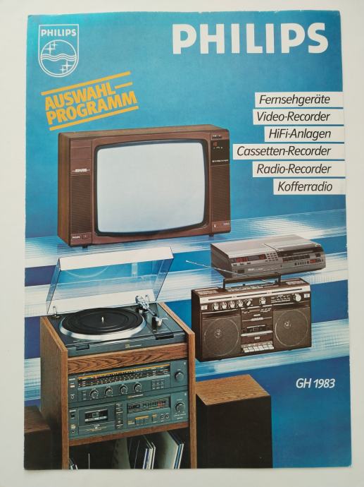 ORIGINALNI PROSPEKT PROGRAM PHILIPS, na kvalitetnom lakiranom papiru, u kojem su prikazani svi uređaji koje je PHILIPS proizvodio 1983. godine. Sastoji se od četiri stranice bogate slikama, opisom i tehničkim podacima za svaki pojedini model, na njemačkom jeziku, prodajem.