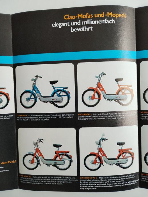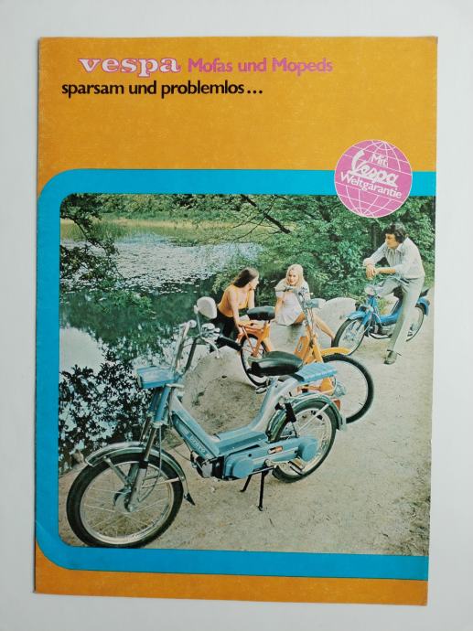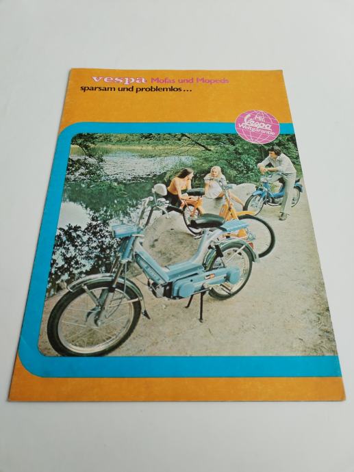 Originalni prospekt program svih VESPA MOFA i MOPEDA, koje je VESPA proizvodila 1970-ih godina. Prospekt je odlično očuvan - kao nov, na 8 stranica, vrlo bogat slikama, tekstom i tehničkim podacima za svaki pojedini model, na njemačkom jeziku, prodajem.