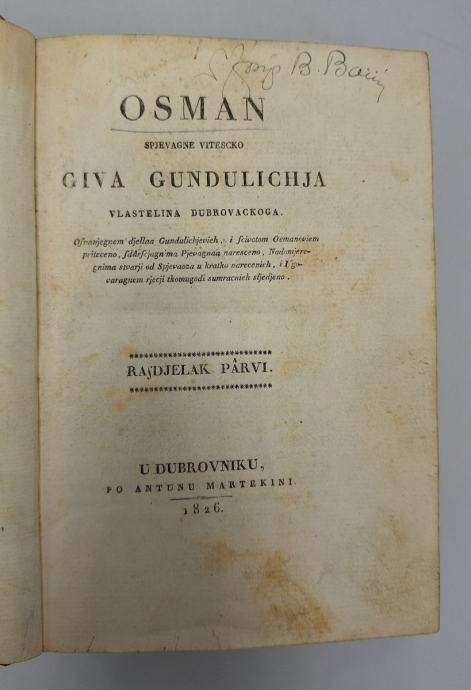 Ivan Gundulić: Osman I-IIIPrvo izdanje. Izuzetno rijetko!Osman se sastoji od 20 pjevanja (14. i 15. je nadopunio Ivan Mažuranić) ispjevanih osmeračkim katrenama s rimom abab.Ukupno sadrži 10428 stihova.U djelu su, uz određene odmake od teme, opjevani događaji vezani uz život, vladavinu i smrt turskog sultana Osmana II. Gundulićevim se rukopisom koristio Nikola Ohmučević koji ga je prepisao te je njegov prijepis danas najstariji poznati rukopis Osmana, jer se Gundulićev autograf nije sačuvao.Prvo izdanje Osmana tiskano je u Dubrovniku 1826. godine s dopunom Pijerka Sorkočevića. Stranica: 49+201+268+270+XXIVDimenzije: 14.5x20Jezik: DubrovnikPismo: LatinicaStanje: Vrlo dobroUvez: TvrdiGodina: 1826