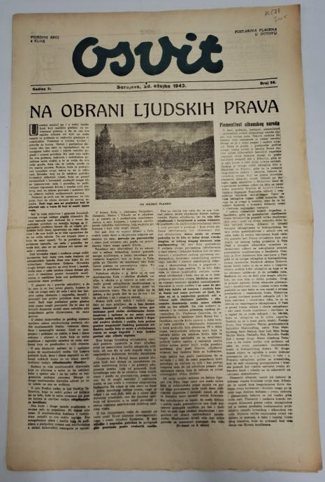 Osvit br. 56/1943.Glavni i odgovorni urednik: Kasim Hadžić Stranica: 8Dimenzije: 32x50Jezik: SarajevoPismo: LatinicaStanje: DobroUvez: MekiGodina: 1943