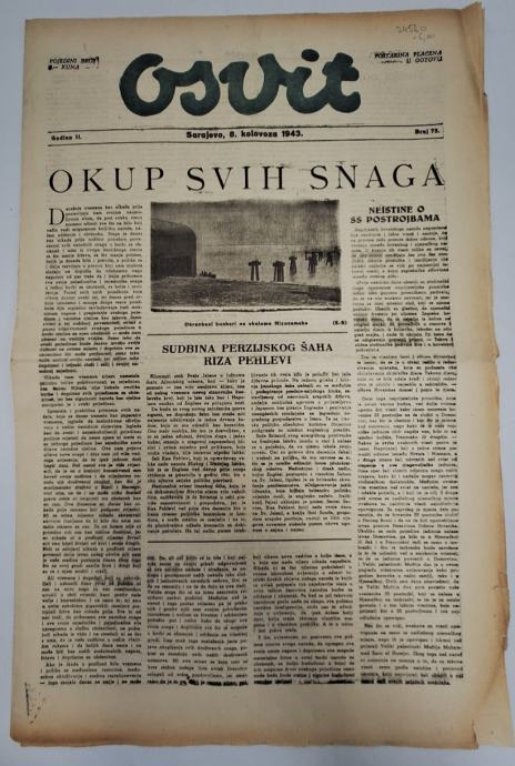 Osvit br. 75/1943.Glavni i odgovorni urednik: Kasim Hadžić Stranica: 8Dimenzije: 32x50Jezik: SarajevoPismo: LatinicaStanje: DobroUvez: MekiGodina: 1943