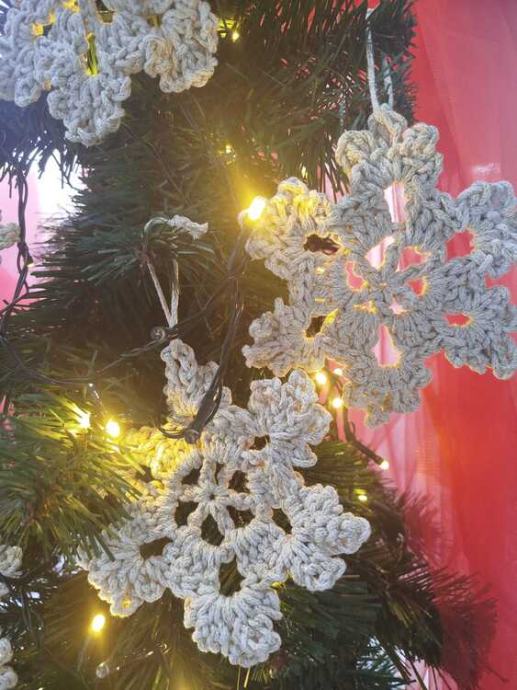 Heklana pahuljica jedva čeka ukrasiti tvoj ovogodišnji bor. Izrađena je od makrame konca (deblji konac) nježne krem boje sa zlatnim nitima zbog čega se lako uklapa u ostatak interijera, a čini detalj koji se ističe.Uključuje 3 komad.Dimenzije za 1 komad:Promjer (najduži krajevi): 13cmSastav: 85% Pamuk, 15% Lurex/metalizirana vlaknaNapomena: Zbog ručne izrade moguće su male varijacije u boji i obliku, ali zato je svaki paket poseban i jedinstven. Ručni rad. Proizvedeno u Hrvatskoj.
