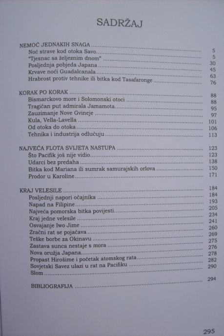 Prvoga rujna 1939. godine započeo je rat u Europi. Gotovo preko noći nestale su države u "munjevitom ratu". Pod utjecajem vojnih uspjeha Njemačke, industrijalci i bankari u Japanu žele dobiti svoj dio "kolača", nova tržišta, nove izvore sirovina i ratne dobitke. Na povijesnoj sjednici održanoj 1. prosinca 1941. godine donesena je odluka da Japan uđe u rat i to već 8. prosinca. Kako se dalje razvijao rat na Pacifiku autor detaljno izlaže u ovoj knjizi, ilustriranoj brojnim fotografijama i crtežima. U prvom je svesku obrađen prodor japanskih snaga (završava bitkom za Midwayske otoke). U drugom je svesku obrađena propast flote izlazećeg sunca (završava činom potpisivanja kapitulacije Japana).