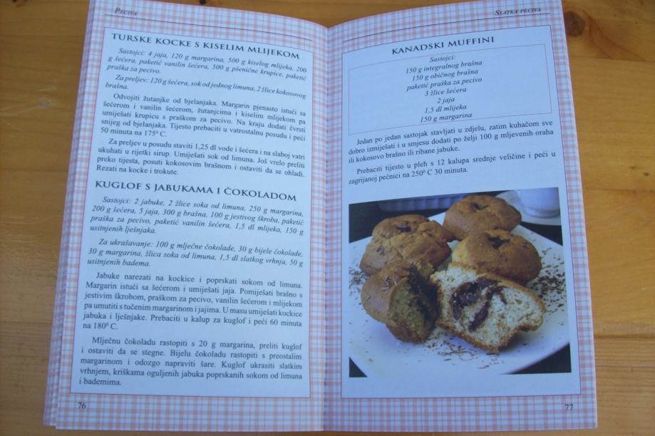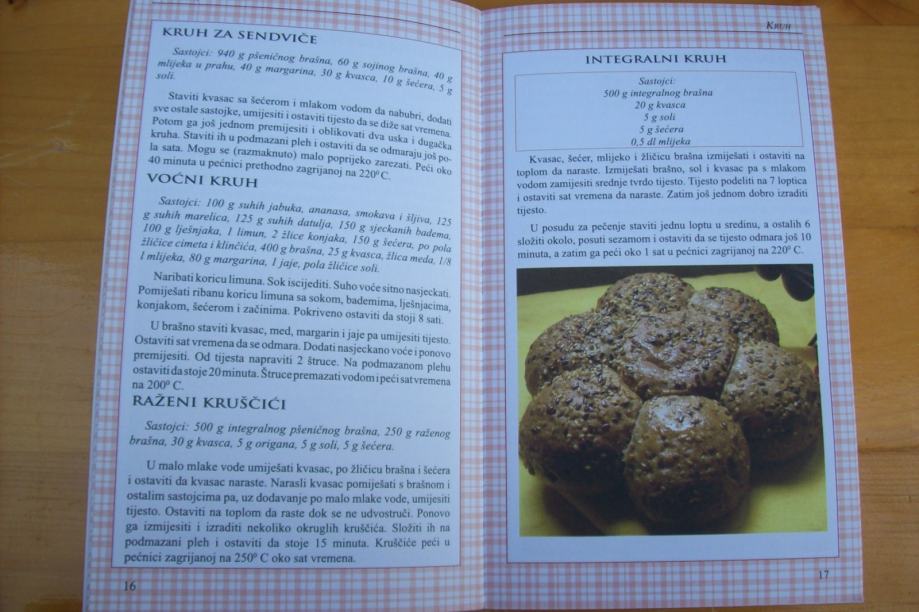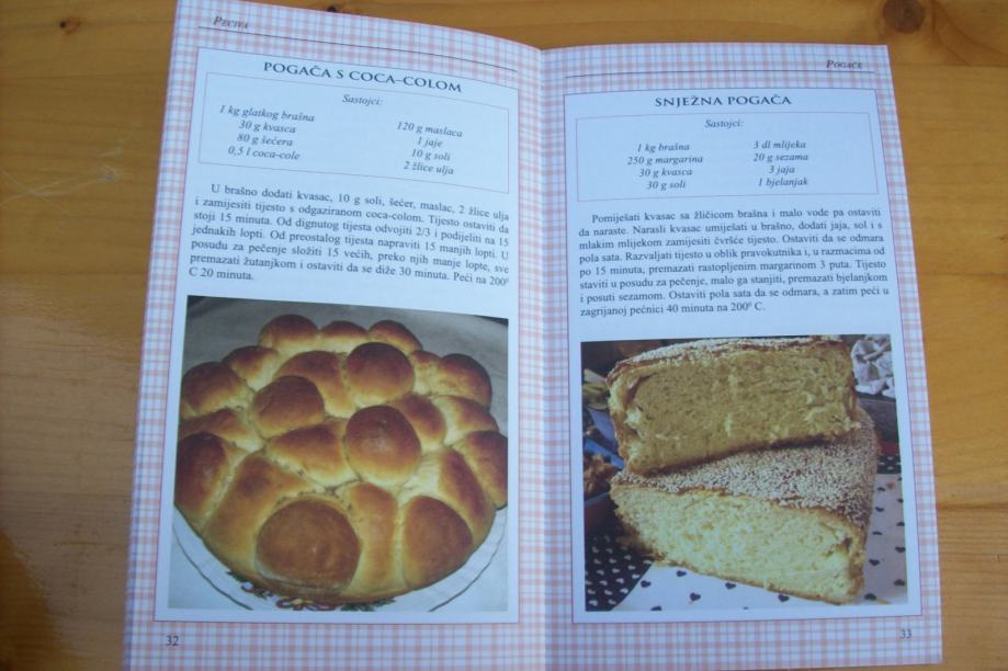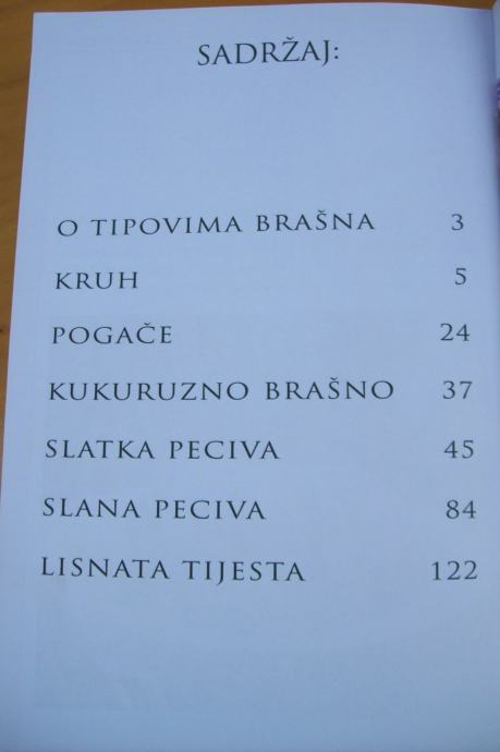 Opis: sve o tipovima brašna, usporedna tablica primjene brašna po tipu i finoći za neke proizvode, tablica mjera na žlice i variva, recepti za razne vrste kruha, pogače, slatka i slana peciva, te lisnata tijesta. Praktični priručnik za svaku domaćicu.