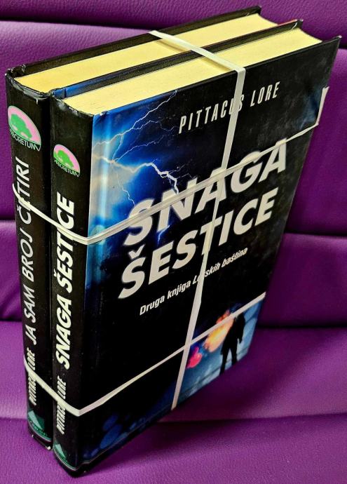 JA SAM BROJ ČETIRIBilo nas je 9 koji smo pobjegli…Broj 1 ubijen je u Maleziji.Broj 2 umoren je u Engleskoj.Broj 3 uhvaćen je u Keniji.Prije nego što krenu za drugima, doći će po mene… Ja sam Broj Četiri.˝Ja sam broj četiri˝ prva je knjiga ˝Lorskih baština˝ namijenjena mladim čitateljima, ljubiteljima akcije i znanstvene fantastike. Po knjizi snimljen je i istoimeni film.SNAGA ŠESTICE Druga knjiga Lorskih baština. Priču o spasu planeta Lorien i njegovih devetoro baštinika, koja je započela uzbudljivim prvim dijelom Ja sam Broj Četiri, ujedno i predloškom za istoimenu filmsku uspješnicu, ovdje pratimo iz dva kuta. Broj Četiri zajedno s Brojem Šest i Samom bježi od Mogadoraca i napušta Raj. No čini se da su se Mogadorci uspjeli domoći vrlo moćna oružja – škrinje koja je pripadala Broju Šest – što će naše junake gotovo stajati života. Čitajući pismo koje mu je Henri ostavio, Broj Četiri nalazi poveznicu između sebe i Samova oca, i to Sama i njega navodi da se vrate u Raj, gdje će zbog Sarine odluke zamalo zaglaviti. Broj Šest čini sve da im pomogne, ali odlazi kad sazna da u Španjolskoj živi netko od Staratelja tko je u nevolji. U Španjolskoj se, pak, skrivaju Broj Sedam, jedna od baštinica planeta Lorien i njezina Starateljica Adelina. Nakon jedanaest godina života u samostanu, Adelinu je napustila svaka nada u obnovu Loriena, pa se pokušava prilagoditi životu časne sestre koja skrbi za ondašnju siročad, posve zanemarujući Sedmicu. Kada u sirotište dovedu sedmogodišnju Ellu, Sedmica Marina odluči uz njezinu pomoć pronaći škrinju koju je Adelina skrila i primiti svoje baštine. Otvaranje škrinje Mogadorcima je znak koji su dugo čekali i oni se svim silama daju u potragu za Marinom i Ellom.Stranica: 287+251Jezik: ZagrebPismo: LatinicaStanje: OdličnoUvez: TvrdiGodina: 2011