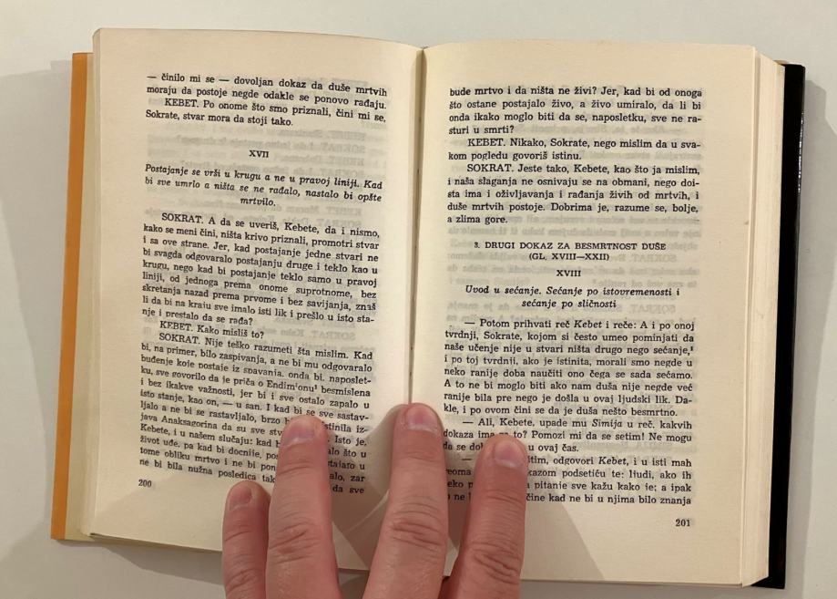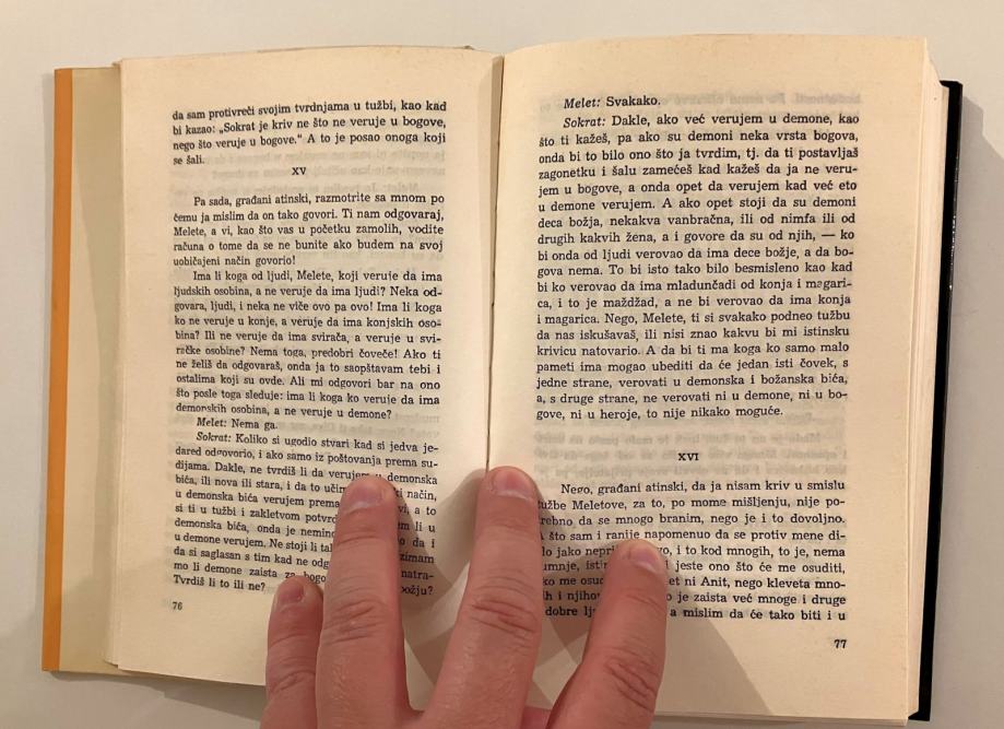 U ovoj knjizi zastupljeni su, većini čitatelja, manje poznati dijalozi: Teag, Harmid, Lahet, Lisid, Eutifron, Euthidem i Hipija veći. Svim tim imenima sugovornik je Sokrat kao inkarnacija vječne grčke mudrosti.