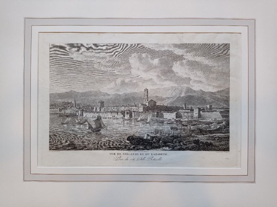 Louis-Francois Cassas i Joseph Lavallée: Pogled na Split i raskužnu bolnicu, s utvrde Bačvice/Vue de Spalatro et du Lazareth prise du cote delle - botticelleVeduta iz monumentalnog djela „Voyage pittoresque dell'Istrie et de la Dalmatie“, Pariz, 1802.Bakrorez, šire margineDimenzije bakroreza: 45x30Ukupne dimenzije: 70x50 Dimenzije: 45x30Jezik: ParizPismo: LatinicaStanje: Vrlo dobroGodina: 1802