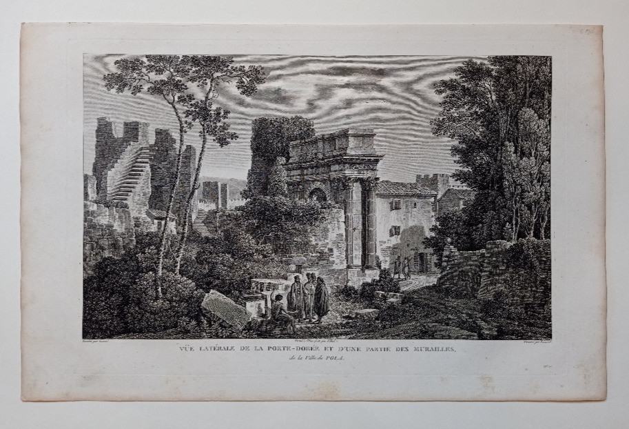 Louis-Francois Cassas i Joseph Lavallée: Postranični pogled na Slavoluk ili Zlatna vrata i gradske zidine Pule / Vue laterale de la porte-doree et d'une partie des muraillesPostranični pogled na Slavoluk ili Zlatna vrata i gradske zidine Pule - Slavoluk u Puli zvan Zlatna vrataVeduta iz monumentalnog djela „Voyage pittoresque dell'Istrie et de la Dalmatie“, Pariz, 1802.Bakrorez, uže margineDimenzije bakroreza: 43.5x29Ukupne dimenzije: 50.5x33Dimenzije: 43.5x29Jezik: ParizPismo: LatinicaStanje: OdličnoGodina: 1802