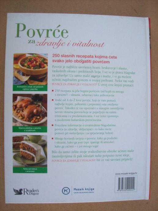 Mozaik knjiga i Reader’s Digest izdali su kuharicu koja će vam pomoći da jedete povrće pripremljeno na jednostavan i ukusan način. A što je najbolje od svega, svaki recept kombinira povrće nužno za zdravlje s hranom koju vaši ukućani obično jedu i vole. Povrće za zdravlje i vitalnost osigurat će vam maksimum hranjivih sastojaka u nevjerojatno ukusnim receptima koji će pomoći u prevenciji bolesti i poboljšanju vašega zdravlja.