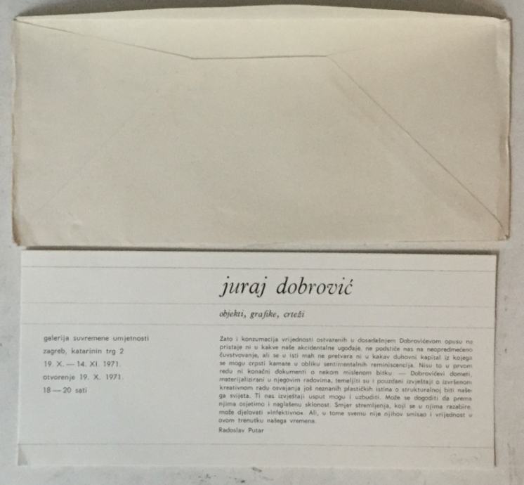 Pozivnica Andriji Mahorovičiću na otvorenje izložbe Juraj Dobrović, ob