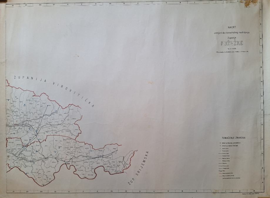 Nacrt zemljarinsko-katastralnog razdieljenja Županije požeškeMjerilo 1:144000Dimenzije: 101.5x76.5Jezik: BudapestPismo: LatinicaStanje: Vrlo dobroUvez: MekiGodina: 1912