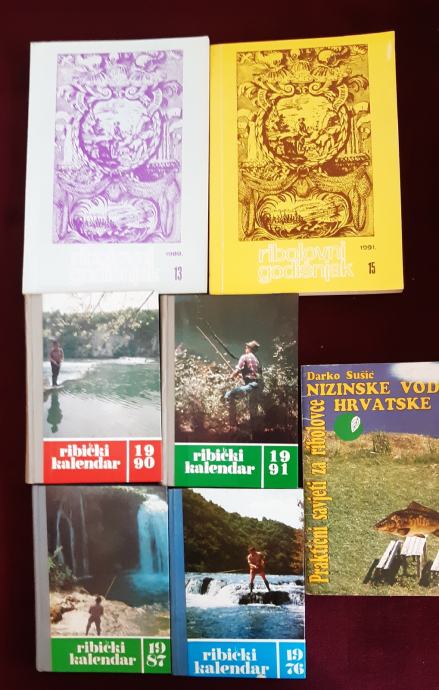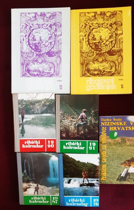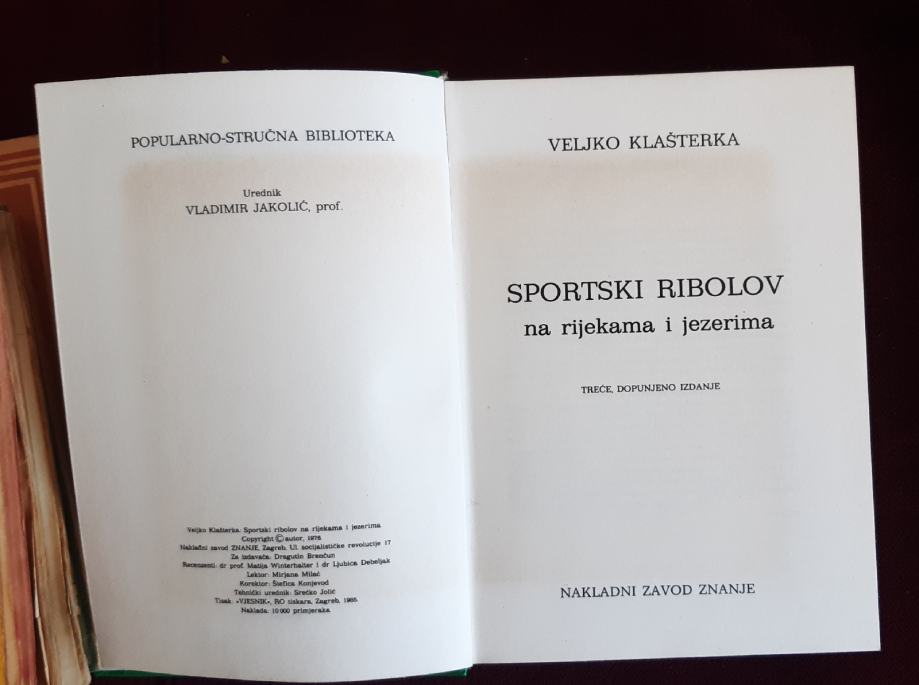 Kniga Veljka Klašterke Sportski ribolov na rijekama i jezerima nakladnika Znanje. Uz knjigu poklanjam ribolovne godišnjake 1989 i 1991, ribičke kalendare1976,1987,1990 1991 g. Te Praktične savjete za ribolovce Nizinske vode hrvatske Darka Sušića.