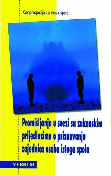 Promišljanja u svezi sa zakonskim prijedlozima o priznavanju zajednica osoba istog spola Dokument Kongregacije za nauk vjere pod naslovom Promišljanja u svezi sa zakonskim prijedlozima o priznavanju zajednica osoba istoga spola, kojeg potpisuju pročelnik Kongregacije za nauk vjere, kardinal Joseph Ratzinger te tajnik Kongregacije nadbiskup Angelo Amato, osvrt je na prijedloge i namjere zakonskog priznavanja zajednica osoba istoga spola, koji su već na putu ostvarenja ili o kojima se razmatra u nekim zemljama, posebice zapadnim. Svrha je dokumenta zaštita i promicanje bitnih obilježja i dostojanstva braka, temelja obitelji i ustanove koja čini društvo, te upućivanje katoličkih političara na ponašanje dosljedno kršćanskoj savjesti, kada se nađu pred nacrtima zakona vezanim uz ovaj problem.Stranica: 24Dimenzije: 195 x 120Jezik: ZagrebPismo: LatinicaStanje: Nova knjigaUvez: MekiGodina: 2003