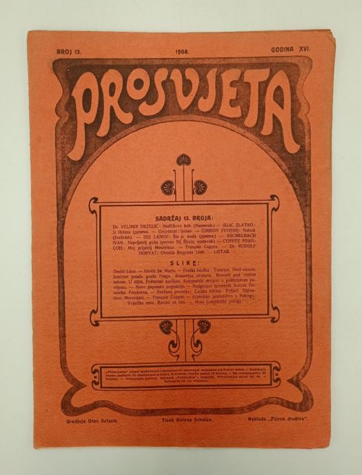 Prosvjeta 13/1908.Urednik: Oton SzlavikStranica: 31Dimenzije: 25.5x35.5Jezik: ZagrebPismo: LatinicaStanje: Vrlo dobroUvez: MekiGodina: 1908