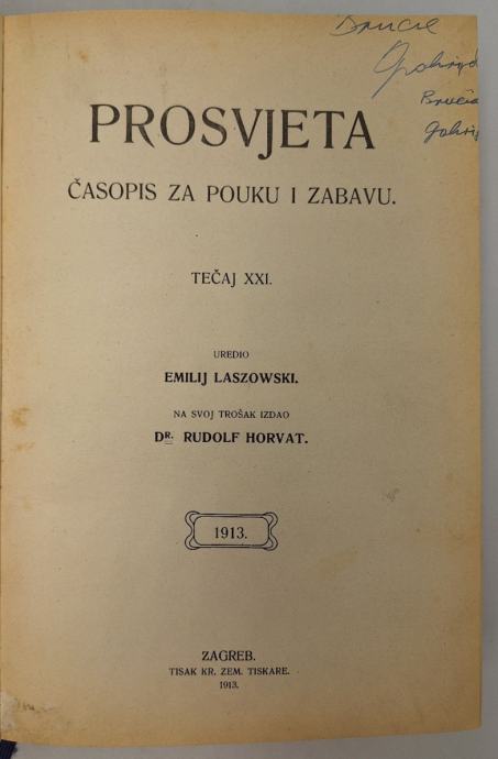 Prosvjeta - časopis za pouku i zabavu-tečaj XXI 1913Uredio:Emilij Laszowski Dimenzije: 18.5x26.5Jezik: ZagrebPismo: LatinicaStanje: DobroUvez: TvrdiGodina: 1913