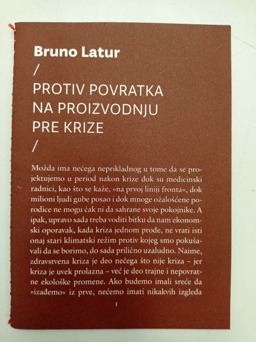 Bruno Latour: Protiv povratka na proizvodnju pre krize »Posljednje što trebamo napraviti je da nastavimo da na istovjetan način raditi sve što smo radili ranije.«(pismo iz karantene, ožujak 2020) Stranica: 11Dimenzije: 10x15Jezik: BeogradPismo: LatinicaStanje: OdličnoUvez: MekiGodina: 2020