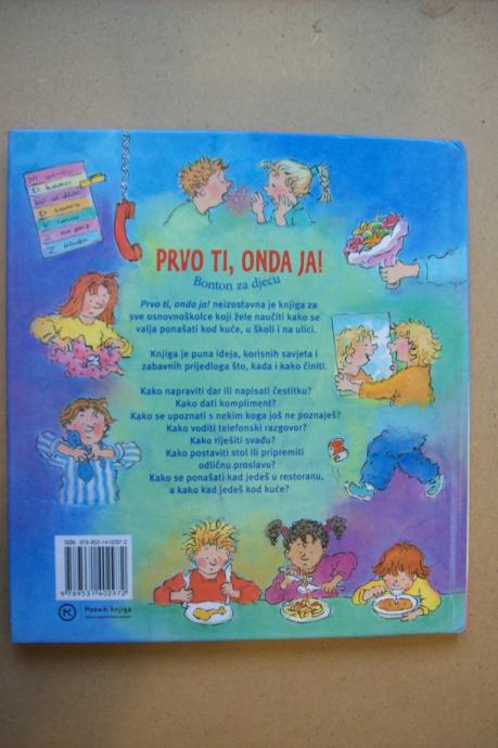"Prvo ti, onda ja!" neizostavna je knjiga za sve osnovnoškolce koji žele naučiti kako se valja ponašati kod kuće, u školi i na ulici. Knjiga je puna ideja, korisnih savjeta i zabavnih prijedloga što, kada i kako činiti.