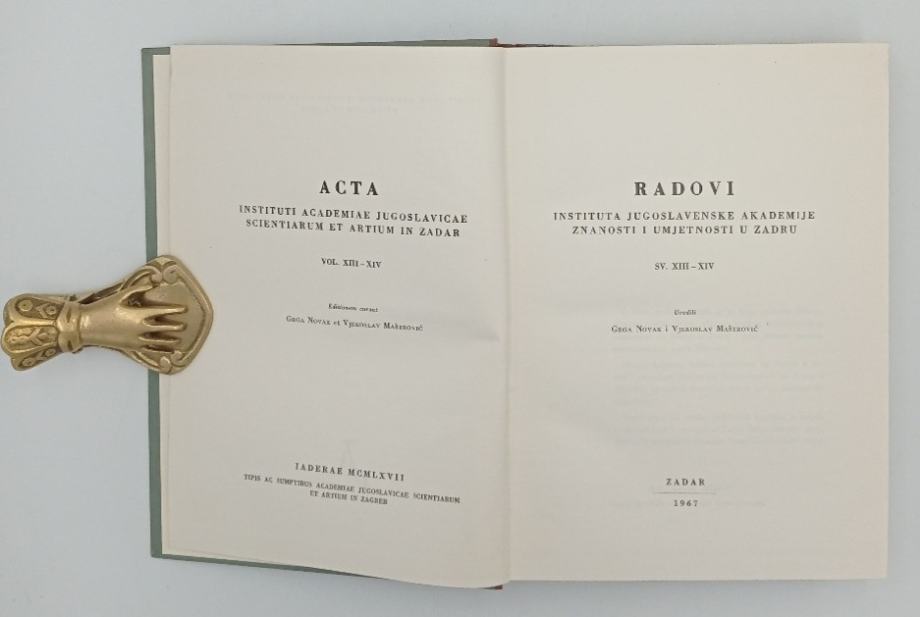 Radovi Instituta JAZU 13-14/ 1967Uredili: Grga Novak, Vjekoslav MaštrovićSadržaj:Eduard Peričić: Samostan sv.Marije u Zadru od njegova osnutka do danasIvo Petricioli: Umjetničja baština samostana sv. Marije u ZadruCvito Fisković: Zadarski zlatar Mate DraganjićCvito Fisković: U potrazi za Jordanićevim poliptihomMarijan Grgić: Dva nepoznata svetomarijska rukopisa u Budimpešti Amos-Rube Filipi: Samostan i crkva sv. Marije u Zadru prema dokumentima iz godine 1579. i 1603.Seid Traljić: Vodeni znakovi u dokumentima i rukopisima samostana sv. Marije u ZadruMarin Oreb: Samostan sv. Frane u ŠibenikuŠime Jurić: O knjižnici samostana franjevaca konventualaca sv. Frane u Šibeniku s posebnim osvrtom na njezinu zbirku inkunabulaMate Zorić: Rukopisi na talijanskom jeziku u knjižnici franjevaca konventualaca u ŠibenikuVladimir Vratović: Rukopis "Proteus oratorius sive ars rhetorica" nepoznata autora iz god.1707.Kruno Prijatelj: Uz Ponzonijeve slike u šibenskoj crkvi sv. FraneLovro Županović: Umjetnost Ivana Lukačića ŠibenčaninaLadislav Šaban: Graditelj orgulja Petar Nakić iz Šibenika Stranica: 463Dimenzije: 17x24Jezik: ZadarPismo: LatinicaStanje: DobroUvez: TvrdiGodina: 1967