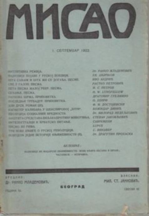 Urednik Ranko Mladenović. Pišu Ivo Andrić, Mihajlo Petrov, Stanslav Vinaver, Rastko Petrović i drugi. Misao, srpski avangardni mjesečnik